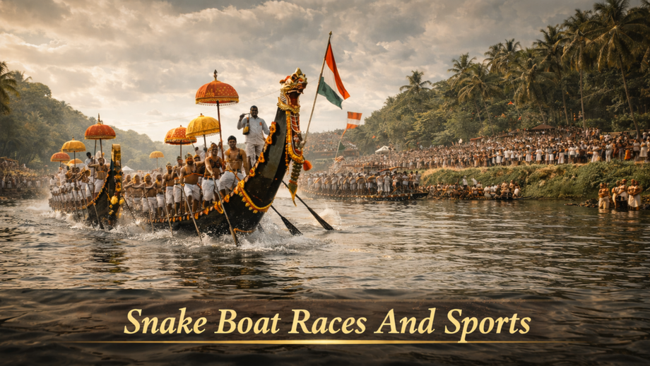 Another vibrant tradition is the Vallamkali, or snake boat races, which take place in Kerala’s backwaters. Long, narrow boats decorated with colourful designs glide across rivers, propelled by synchronized rowing teams. Accompanied by rhythmic songs and chants, these races are a spectacle of teamwork, endurance, and cultural pride. Many villages also organize traditional sports and games, keeping the spirit of friendly competition alive during the festival.